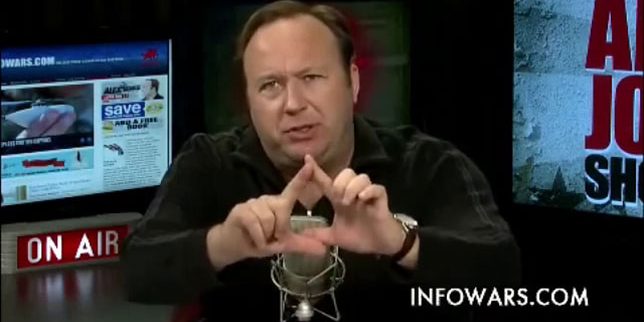 Alex Jones making the infamous Illuminati Pyramid Sign.