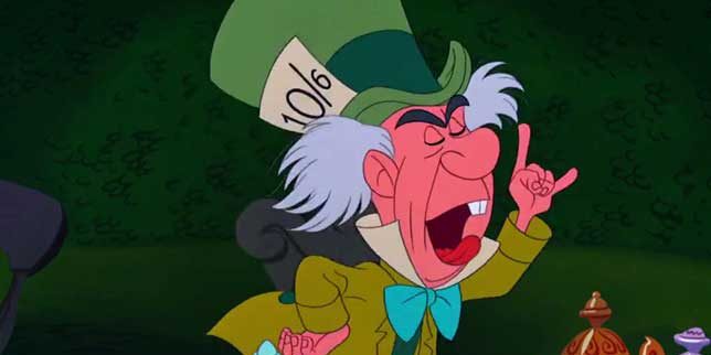Alice in Wonderland characters Mad Hatter and the Walrus both flash the Devil’s horns Illuminati sign.