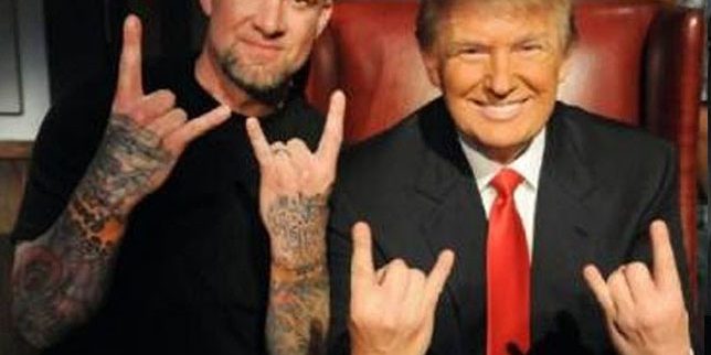 Businessman and Republican presidential candidate Donald Trump raising the horns. The two fingers pointing up are met to represent Satan’s horns.