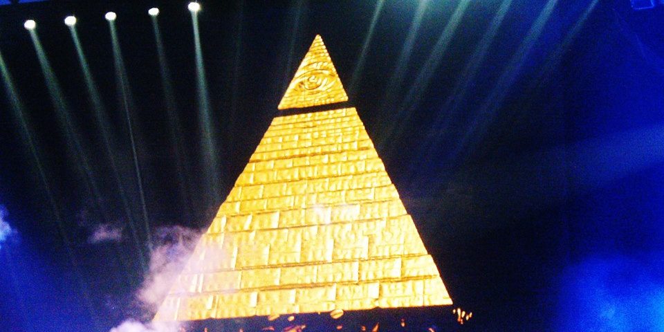Illuminati Watcher posted these pictures from Miley Cyrus Bangerz Tour clearly using the king of all Illuminati symbol, the all-seeing eye floating over a pyramid.